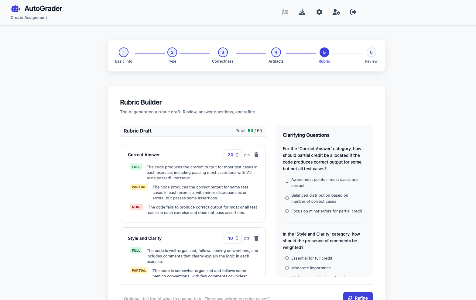 Setting up an assignment is guided by a step-by-step wizard. Instructors specify the assignment type, upload reference solutions, and answer a few clarifying questions generated by the AI. The system then produces a full rubric draft with per-category scoring criteria at the FULL, PARTIAL, and NONE levels — ready to use or refine.