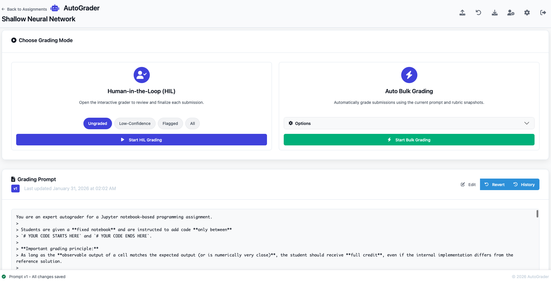 TAs can choose between Human-in-the-Loop mode (review each submission interactively) and Auto Bulk Grading (grade an entire section automatically, then review flagged or low-confidence submissions).