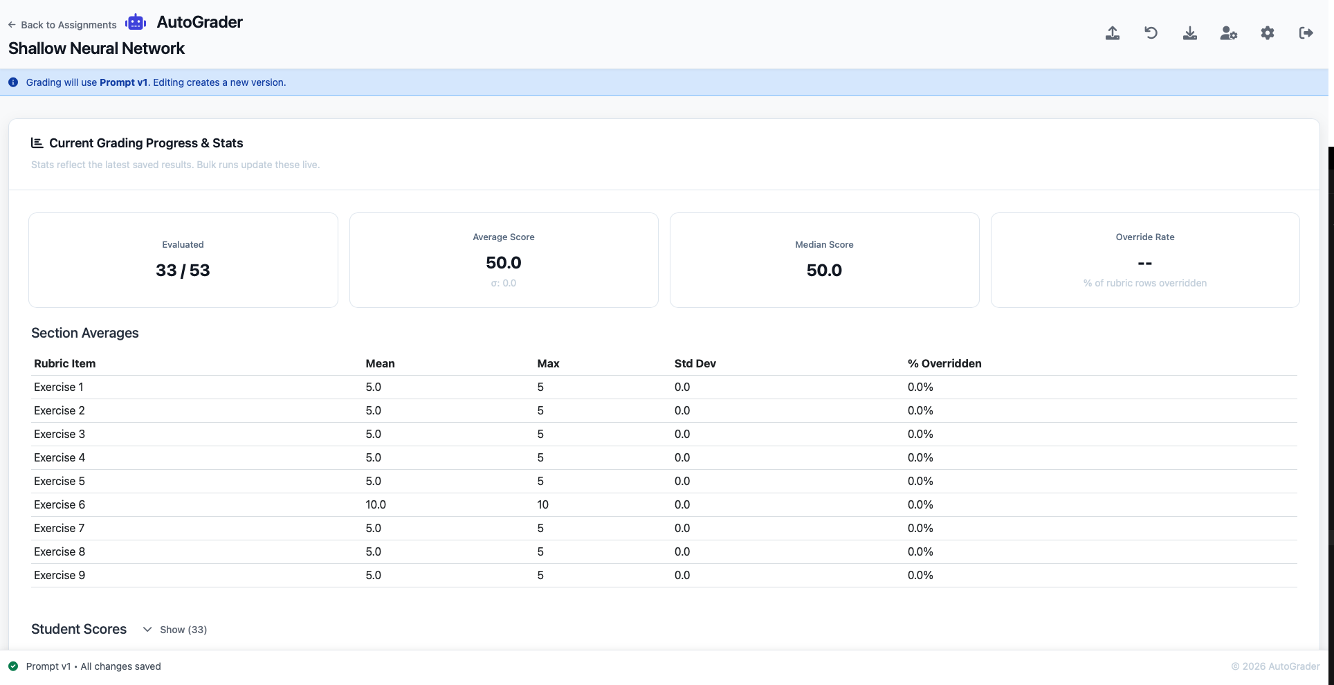 These policies are automatically enforced in subsequent grading runs. Over time, the system converges toward the instructor’s grading style. In practice, we observed a 68% decline in override rates after just a few grading cycles — the system was picking up on patterns like notation conventions, common partial-credit scenarios, and edge cases that the original rubric didn’t explicitly address.
