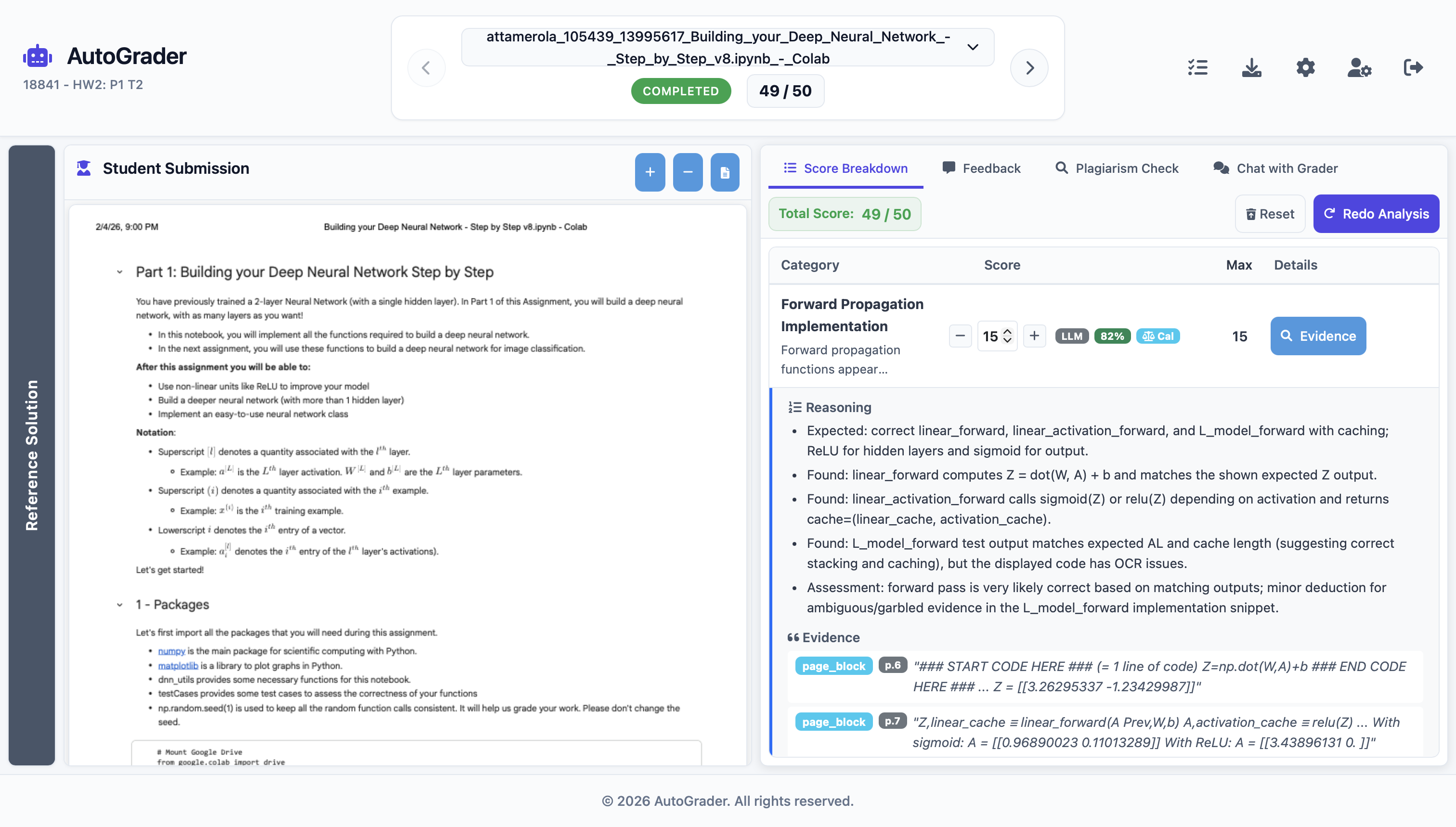 AutoGrader enforces a simple rule: every score must be grounded in the student’s submission. The AI cannot award or deduct points without citing its evidence. This makes the entire grading process auditable — every decision has a paper trail.