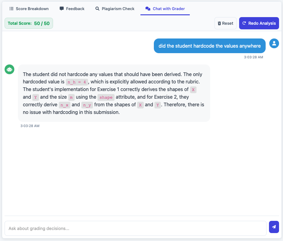 Sometimes you want to ask a follow-up question about a specific submission without re-running the entire analysis. AutoGrader includes a conversational AI console where TAs can ask natural-language questions about any submission — “did the student hardcode the values anywhere?”, “is the loss function implemented correctly?” — and get responses grounded in the actual submission content.