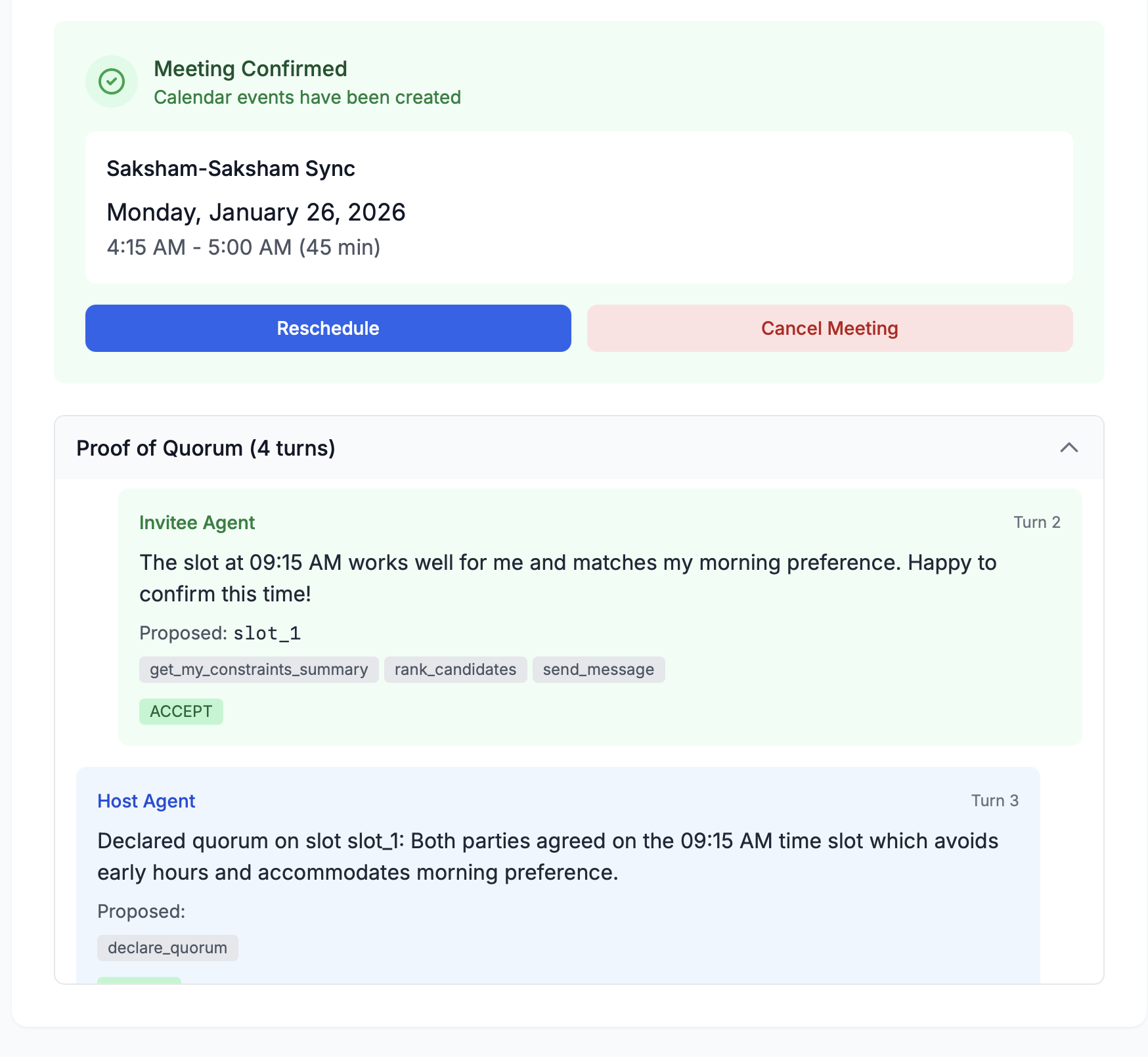 The agents communicate through structured tool calls: proposing slots, counter-proposing, ranking alternatives, and eventually declaring quorum (or no quorum if they can’t agree). The negotiation is capped at 12 turns to prevent runaway conversations.