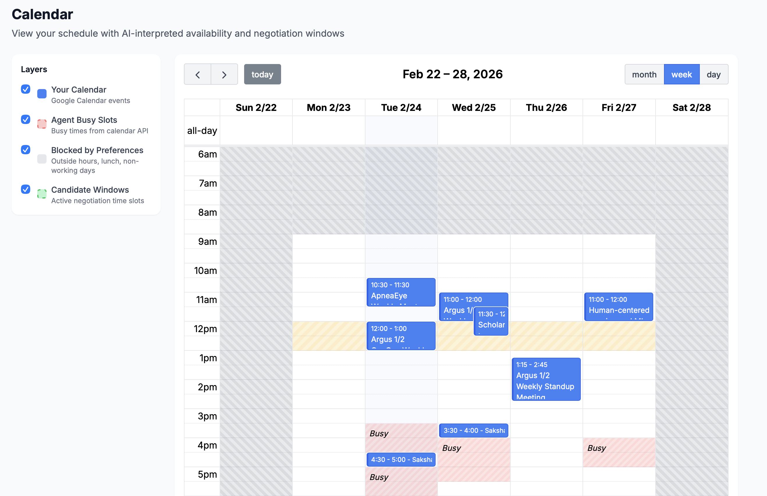Next.js 14 with the App Router for both frontend and API routes. Google OAuth and Calendar API for authentication and calendar integration. PostgreSQL (Neon) with Prisma ORM for persistence. OpenAI GPT-4o for the negotiation agents with structured tool calling. Tailwind CSS and FullCalendar.js for the UI.