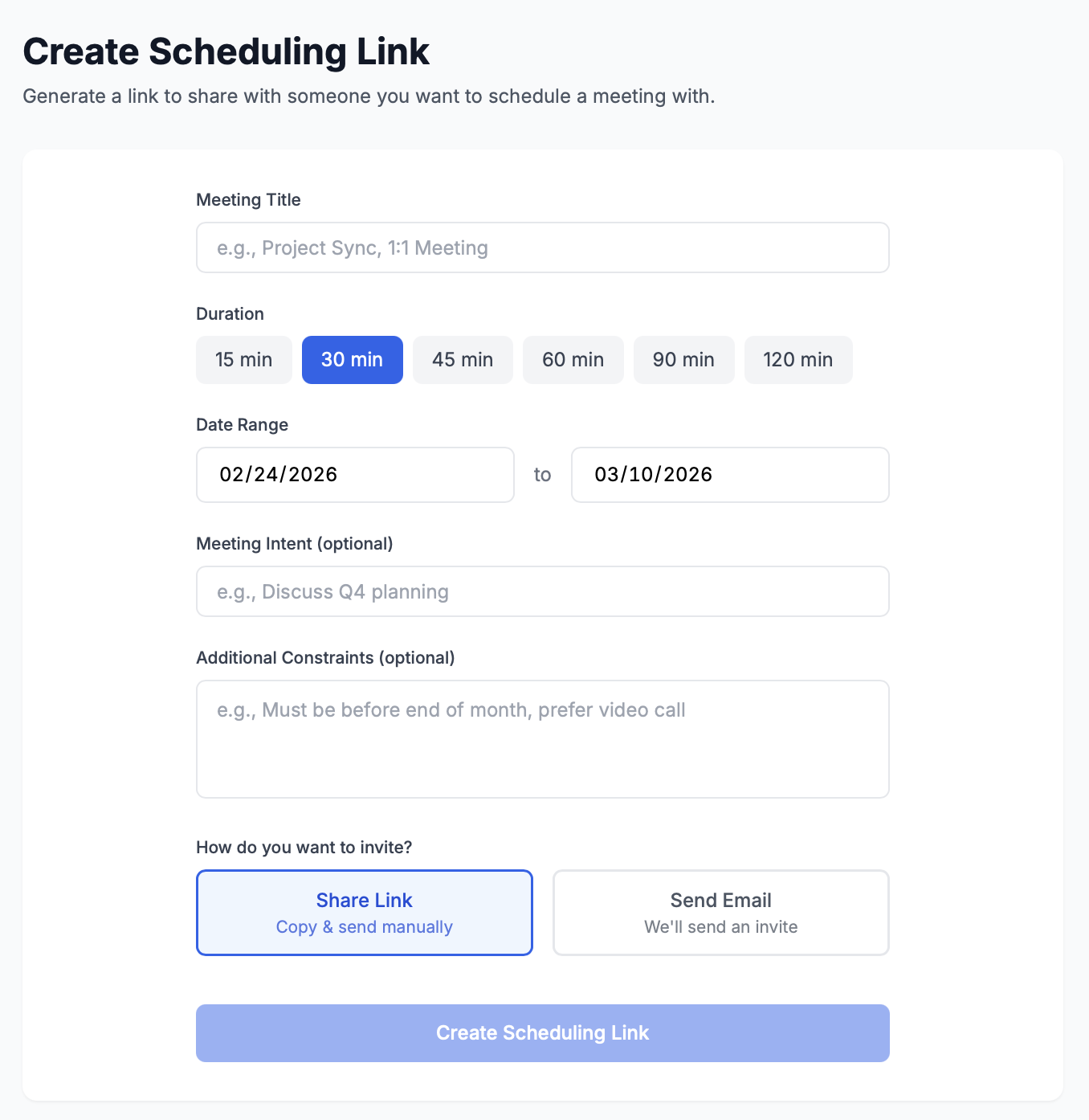 The host creates a link specifying the meeting title, duration, date range, and intent. This link is shared with the invitee.