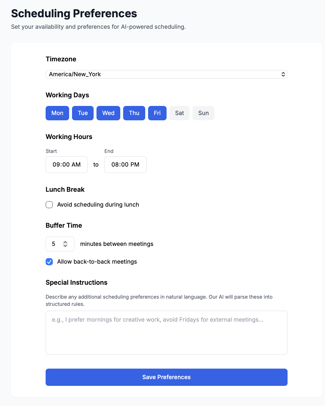 Each user configures their scheduling constraints: working hours, preferred time of day (morning, midday, afternoon), lunch breaks, buffer time between meetings, and any special instructions. These preferences persist across all scheduling sessions.
